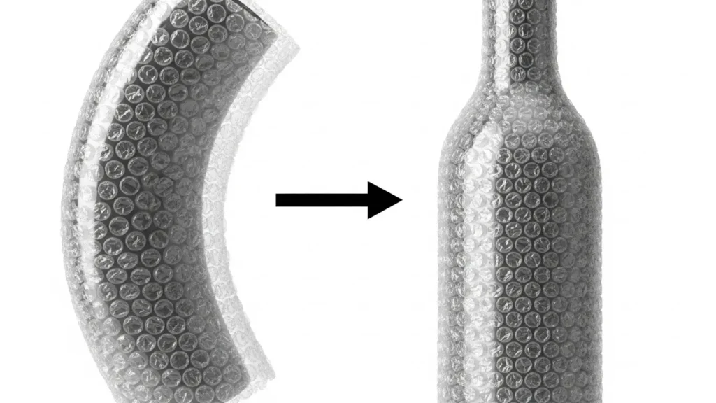 凸面を内側にすることで、プチプチ自体が商品をしっかりとグリップ(把持)し、ツルツルしたガラス瓶でも滑りにくく固定してくれる効果が期待できます。