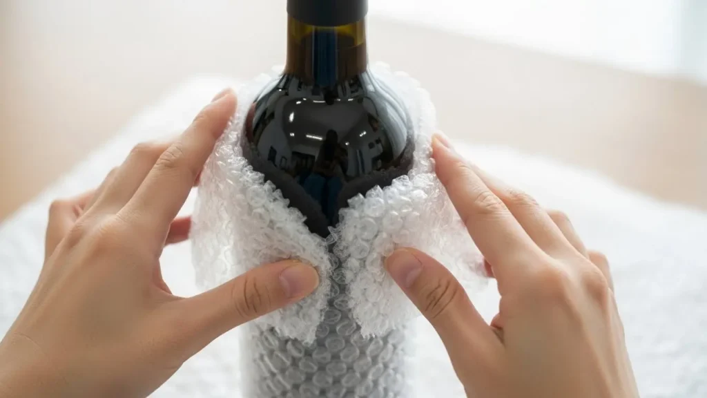 - ワインボトル: 凸面を内側にして、ボトルの首から底まで隙間なく巻き付けます。特に底部分は衝撃を受けやすいので、余った部分を折り込んで厚く保護しましょう。