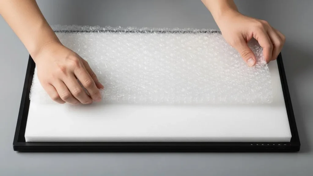 モニターを梱包する際は、いきなりプチプチで巻くのはNGです。まずは画面部分に、柔らかい発泡シート(ミラーマット)やきめ細かい布、あるいは新聞紙などを当てて保護層を作り、その上から全体をプチプチで包むという「二重構造」にするのが安全です。