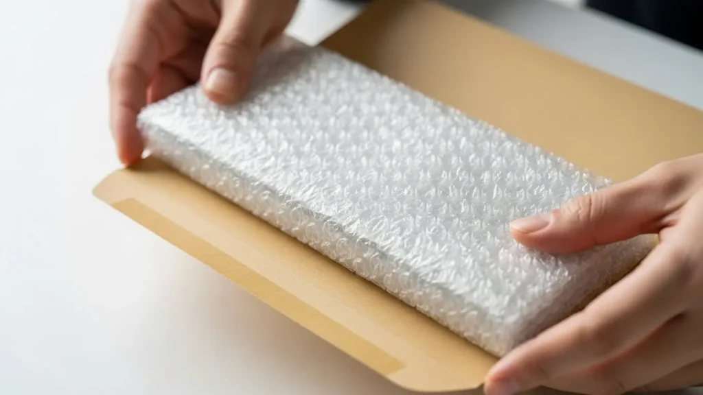 商品を丁寧にプチプチで包んだ後、それを紙の封筒や宅配袋(レターパックなど)に入れて発送するシーンを想像してみてください。