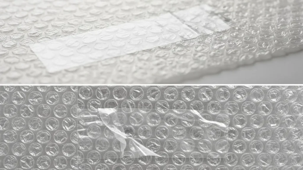 プチプチの素材であるポリエチレンは、もともとテープが付きにくい素材です。必ず粘着力が強く、素材の相性が良い「透明梱包用テープ(OPPテープ)」を使用しましょう。