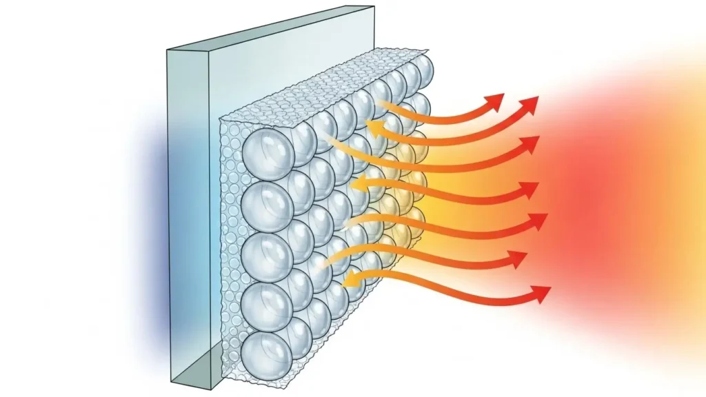 | 夏 | 外からの日射熱を反射して入れない | 外側(太陽側) | アルミの鏡のような性質を利用して、強烈な直射日光や輻射熱を窓際で跳ね返します。これにより、熱が室内に入り込むのを防ぎます。 |